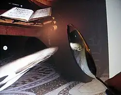 L'étagère inférieure comporte dans sa partie droite trois objets reliés à la musique, un luth à six choeurs, un livre de psaumes et quatre flûtes dans un étui qui révèle également un emplacement vide.