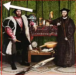 L'étrange figure qui se trouve au premier plan, qui ressemble pour certains à un os de seiche, est un crâne fortement déformé par une anamorphose. Ce type de déformation était à la mode dans l'Angleterre des Tudors. La National Portrait Gallery de Londres possède d'ailleurs un portrait d'Édouard VI d'Angleterre par William Scrots[45] qui utilise ce principe.