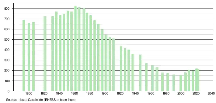 L'évolution du nombre d'habitants est connue à travers les recensements de la population effectués dans la commune depuis 1793. Pour les communes de moins de 10 000 habitants, une enquête de recensement portant sur toute la population est réalisée tous les cinq ans, les populations de référence des années intermédiaires étant quant à elles estimées par interpolation ou extrapolation[27]. Pour la commune, le premier recensement exhaustif entrant dans le cadre du nouveau dispositif a été réalisé en 2005[28].