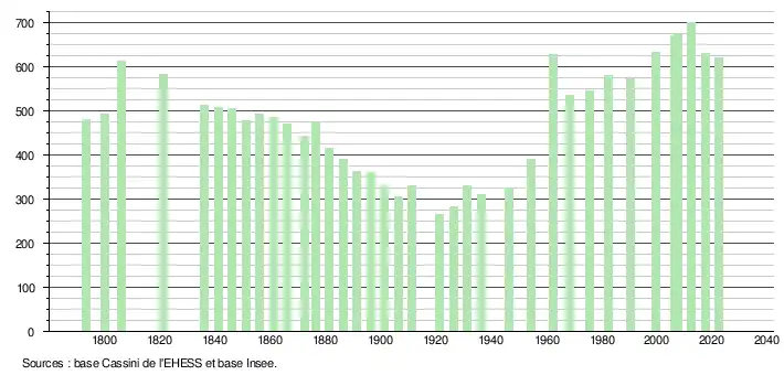 L'évolution du nombre d'habitants est connue à travers les recensements de la population effectués dans la commune depuis 1793. Pour les communes de moins de 10 000 habitants, une enquête de recensement portant sur toute la population est réalisée tous les cinq ans, les populations de référence des années intermédiaires étant quant à elles estimées par interpolation ou extrapolation[37]. Pour la commune, le premier recensement exhaustif entrant dans le cadre du nouveau dispositif a été réalisé en 2007[38].
