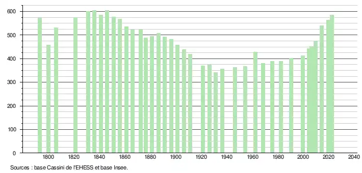 L'évolution du nombre d'habitants est connue à travers les recensements de la population effectués dans la commune depuis 1793. Pour les communes de moins de 10 000 habitants, une enquête de recensement portant sur toute la population est réalisée tous les cinq ans, les populations de référence des années intermédiaires étant quant à elles estimées par interpolation ou extrapolation[35]. Pour la commune, le premier recensement exhaustif entrant dans le cadre du nouveau dispositif a été réalisé en 2004[36].