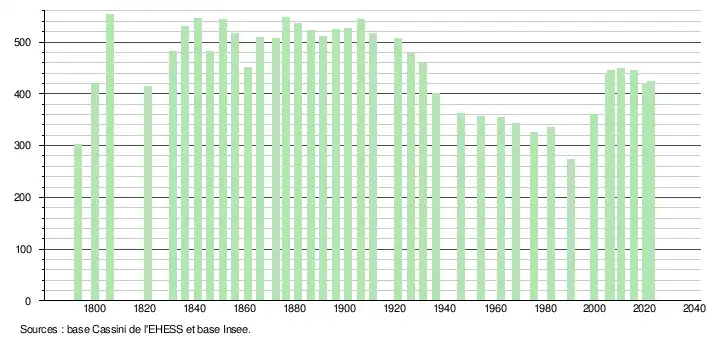 L'évolution du nombre d'habitants est connue à travers les recensements de la population effectués dans la commune depuis 1793. Pour les communes de moins de 10 000 habitants, une enquête de recensement portant sur toute la population est réalisée tous les cinq ans, les populations de référence des années intermédiaires étant quant à elles estimées par interpolation ou extrapolation[26]. Pour la commune, le premier recensement exhaustif entrant dans le cadre du nouveau dispositif a été réalisé en 2005[27].