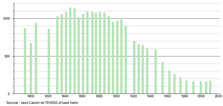 L'évolution du nombre d'habitants est connue à travers les recensements de la population effectués dans la commune depuis 1793. À partir du , les populations légales des communes sont publiées annuellement dans le cadre d'un recensement qui repose désormais sur une collecte d'information annuelle, concernant successivement tous les territoires communaux au cours d'une période de cinq ans. Pour les communes de moins de 10 000 habitants, une enquête de recensement portant sur toute la population est réalisée tous les cinq ans, les populations légales des années intermédiaires étant quant à elles estimées par interpolation ou extrapolation[3]. Pour la commune, le premier recensement exhaustif entrant dans le cadre du nouveau dispositif a été réalisé en 2005[4],[Note 1].