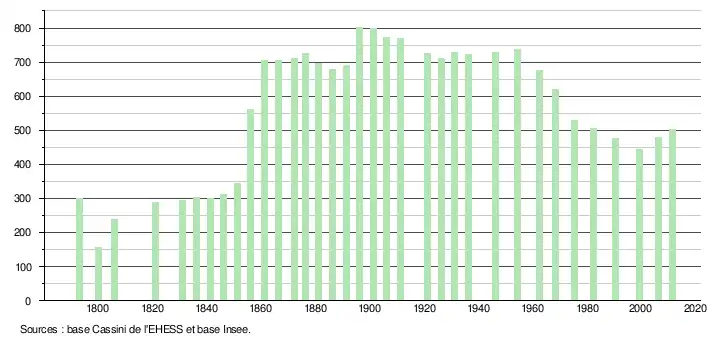L'évolution du nombre d'habitants est connue à travers les recensements de la population effectués dans la commune depuis 1793. À partir du , les populations légales des communes sont publiées annuellement dans le cadre d'un recensement qui repose désormais sur une collecte d'information annuelle, concernant successivement tous les territoires communaux au cours d'une période de cinq ans. Pour les communes de moins de 10 000 habitants, une enquête de recensement portant sur toute la population est réalisée tous les cinq ans, les populations légales des années intermédiaires étant quant à elles estimées par interpolation ou extrapolation[36]. Pour la commune, le premier recensement exhaustif entrant dans le cadre du nouveau dispositif a été réalisé en 2006[37],[Note 1].
