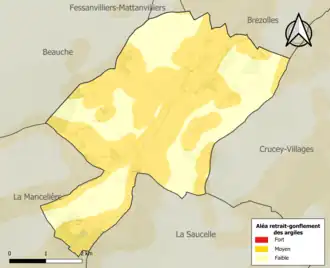 Le retrait-gonflement des sols argileux est susceptible d'engendrer des dommages importants aux bâtiments en cas d’alternance de périodes de sécheresse et de pluie. 61 % de la superficie communale est en aléa moyen ou fort (52,8 % au niveau départemental et 48,5 % au niveau national). Sur les 84 bâtiments dénombrés sur la commune en 2019, 64 sont en aléa moyen ou fort, soit 76 %, à comparer aux 70 % au niveau départemental et 54 % au niveau national. Une cartographie de l'exposition du territoire national au retrait gonflement des sols argileux est disponible sur le site du BRGM[18],[Carte 2].