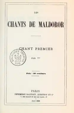 Le premier des Chants de Maldoror a été publié à compte d'auteur et anonymement durant l'automne 1868, d'abord fabriqué en août chez l'imprimeur Gustave Balitout, Questroy et Cie, puis diffusé en novembre à Paris en deux points de vente ; par la suite, ce premier chant est repris dans un recueil de poésies publié par Évariste Carrance intitulé Les Parfums de l'âme à Bordeaux en 1869.