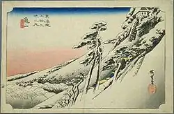- ↑ Mishima compte à juste titre parmi les estampes les plus connues de la série. Elle est très représentative de l'intérêt porté par Hiroshige aux ambiances particulières, brumes, neige ou encore paysages nocturnes