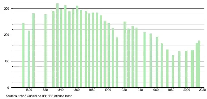 L'évolution du nombre d'habitants est connue à travers les recensements de la population effectués dans la commune depuis 1793. Pour les communes de moins de 10 000 habitants, une enquête de recensement portant sur toute la population est réalisée tous les cinq ans, les populations de référence des années intermédiaires étant quant à elles estimées par interpolation ou extrapolation[5]. Pour la commune, le premier recensement exhaustif entrant dans le cadre du nouveau dispositif a été réalisé en 2007[6].