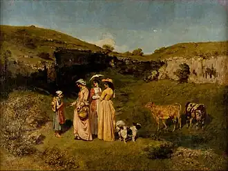 La trentaine passée, Courbet présente son tableau pour la première fois au public au Salon de Paris en avril 1852 sous le titre Les Demoiselles de village faisant l'aumône à une gardeuse de vaches dans un vallon d'Ornans[1]. Il est immédiatement acheté par le duc de Morny, nonobstant une polémique lancée par la presse et une partie du public. Par exemple, le critique d'art Théophile Gautier se montre réservé, trouvant la toile inaboutie[2]. D'autres, comme Gustave Planche, Eugène Loudun ou Louis Énault, jugent les règles de composition, en particulier celle de la perspective, ici comme bafouées ou travesties (la petitesse relative des vaches), et les jeunes femmes, « assez laides », et « endimanchées de façon incongrue ». Le tableau allait être remontré en 1855 lors de l'Exposition universelle et provoquer à nouveau des réactions négatives, la critique portant cette fois son jugement sur le malaise que provoquerait cette « représentation de provinciales habillées à la mode parisienne ». Cette toile fit autant parler de Courbet, sinon plus, qu'Un enterrement à Ornans. Elle fait partie, selon Michael Fried, des « toiles de la percée » et participent d'une stratégie du scandale[3].