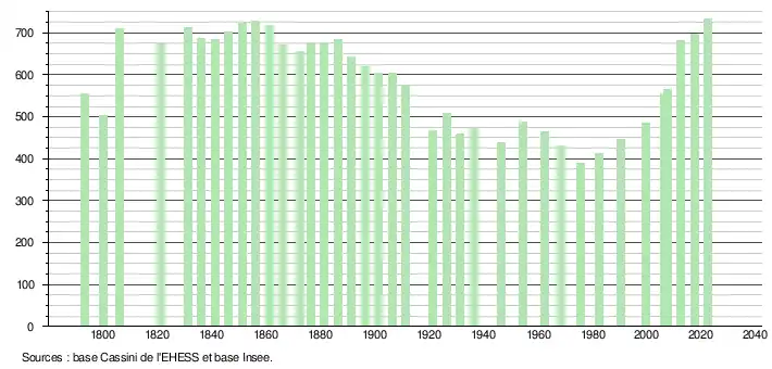L'évolution du nombre d'habitants est connue à travers les recensements de la population effectués dans la commune depuis 1793. Pour les communes de moins de 10 000 habitants, une enquête de recensement portant sur toute la population est réalisée tous les cinq ans, les populations de référence des années intermédiaires étant quant à elles estimées par interpolation ou extrapolation[19]. Pour la commune, le premier recensement exhaustif entrant dans le cadre du nouveau dispositif a été réalisé en 2007[20].