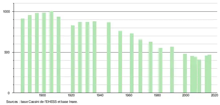 L'évolution du nombre d'habitants est connue à travers les recensements de la population effectués dans la commune depuis 1886. Pour les communes de moins de 10 000 habitants, une enquête de recensement portant sur toute la population est réalisée tous les cinq ans, les populations de référence des années intermédiaires étant quant à elles estimées par interpolation ou extrapolation[14]. Pour la commune, le premier recensement exhaustif entrant dans le cadre du nouveau dispositif a été réalisé en 2004[15].