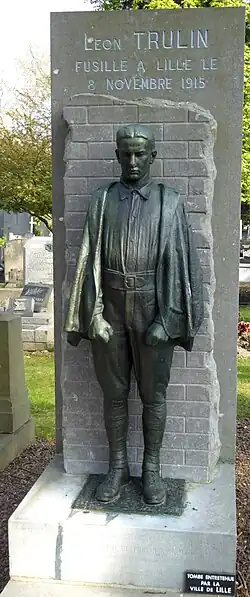 Félix-Alexandre Desruelles est également l'auteur d'une statue de Léon Trulin où ce dernier apparaît debout, dos au mur, les poings serrés et le regard résolu. À ses pieds, une épitaphe explicite les circonstances et l'attitude : « ...et je saurai mourir courageusement... » Cette statue, qui domine la tombe du jeune résistant au cimetière de l'Est, est inaugurée le [5]. Elle fait singulièrement penser au monument des Fusillés lillois, avec lequel elle semble dialoguer et qu'elle complète en nous montrant celui qui était à terre et dont on ne pouvait pas voir le visage.