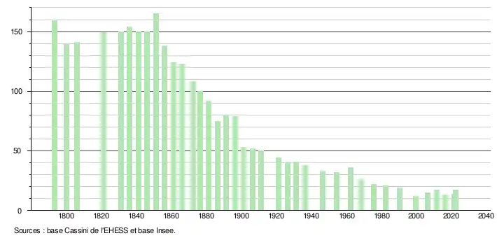 L'évolution du nombre d'habitants est connue à travers les recensements de la population effectués dans la commune depuis 1793. Pour les communes de moins de 10 000 habitants, une enquête de recensement portant sur toute la population est réalisée tous les cinq ans, les populations de référence des années intermédiaires étant quant à elles estimées par interpolation ou extrapolation[13]. Pour la commune, le premier recensement exhaustif entrant dans le cadre du nouveau dispositif a été réalisé en 2006[14].