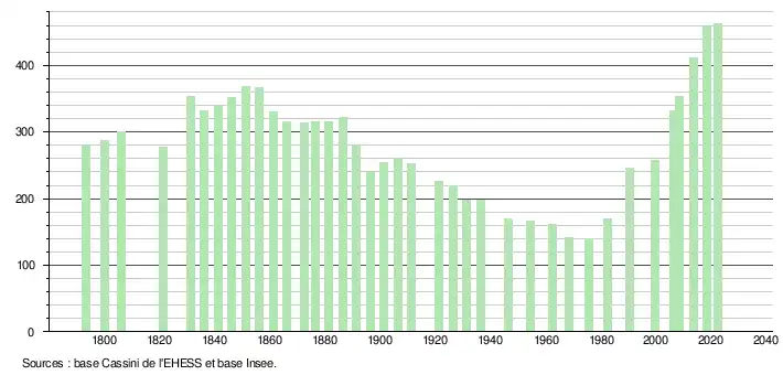 L'évolution du nombre d'habitants est connue à travers les recensements de la population effectués dans la commune depuis 1793. Pour les communes de moins de 10 000 habitants, une enquête de recensement portant sur toute la population est réalisée tous les cinq ans, les populations de référence des années intermédiaires étant quant à elles estimées par interpolation ou extrapolation[18]. Pour la commune, le premier recensement exhaustif entrant dans le cadre du nouveau dispositif a été réalisé en 2008[19].