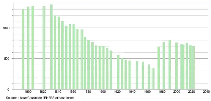 L'évolution du nombre d'habitants est connue à travers les recensements de la population effectués dans la commune depuis 1793. Pour les communes de moins de 10 000 habitants, une enquête de recensement portant sur toute la population est réalisée tous les cinq ans, les populations de référence des années intermédiaires étant quant à elles estimées par interpolation ou extrapolation[17]. Pour la commune, le premier recensement exhaustif entrant dans le cadre du nouveau dispositif a été réalisé en 2008[18].