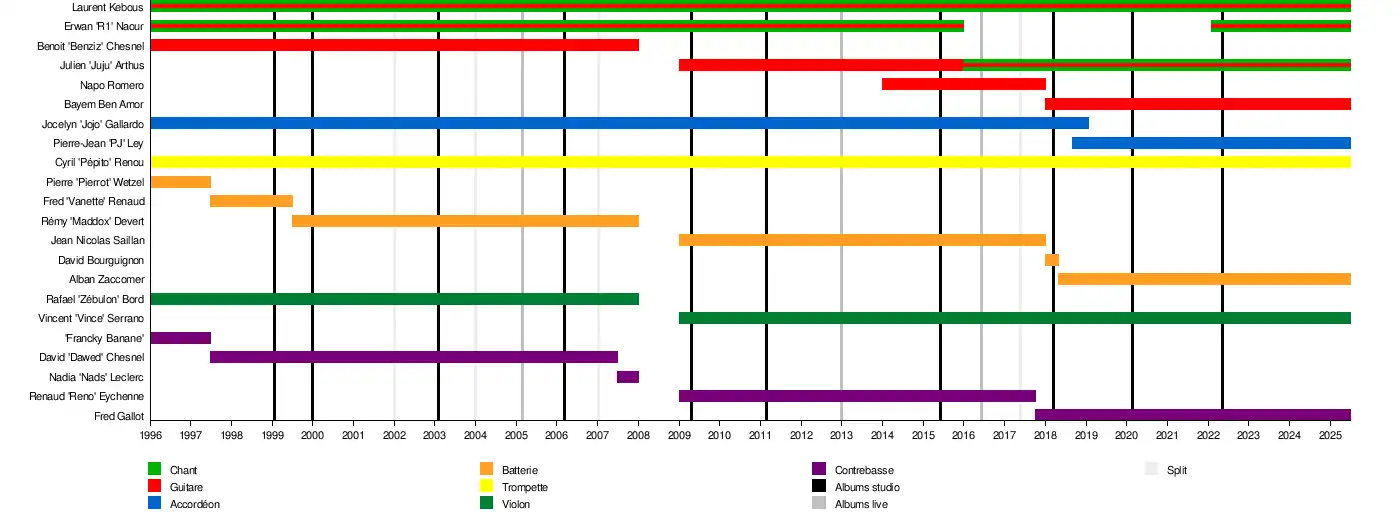 - Erwan « R1 Wallace » Naour — chant, guitare (1996—2016) (depuis 2022)