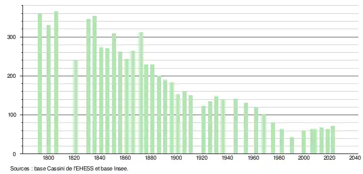 L'évolution du nombre d'habitants est connue à travers les recensements de la population effectués dans la commune depuis 1793. Pour les communes de moins de 10 000 habitants, une enquête de recensement portant sur toute la population est réalisée tous les cinq ans, les populations de référence des années intermédiaires étant quant à elles estimées par interpolation ou extrapolation[36]. Pour la commune, le premier recensement exhaustif entrant dans le cadre du nouveau dispositif a été réalisé en 2008[37].