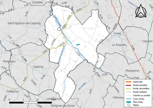 Les communes limitrophes sont Caplong, La Roquille, Landerrouat, Margueron, Riocaud, Saint-André-et-Appelles, Saint-Quentin-de-Caplong et Savignac-de-Duras.