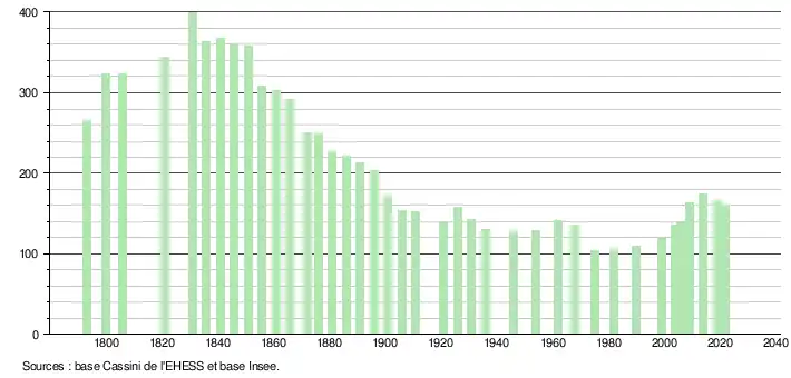L'évolution du nombre d'habitants est connue à travers les recensements de la population effectués dans la commune depuis 1793. Pour les communes de moins de 10 000 habitants, une enquête de recensement portant sur toute la population est réalisée tous les cinq ans, les populations de référence des années intermédiaires étant quant à elles estimées par interpolation ou extrapolation[26]. Pour la commune, le premier recensement exhaustif entrant dans le cadre du nouveau dispositif a été réalisé en 2004[27].