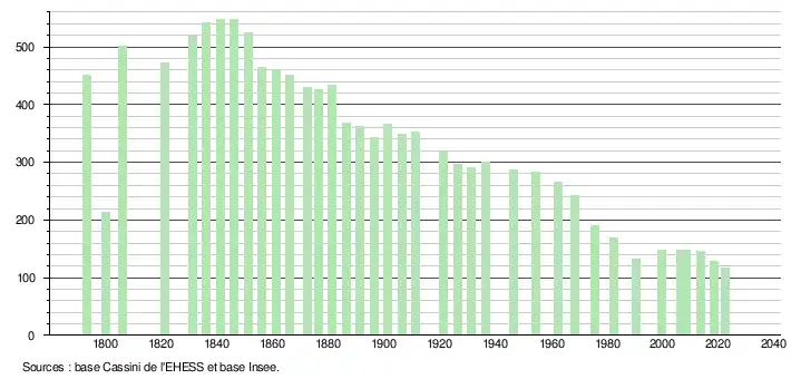 L'évolution du nombre d'habitants est connue à travers les recensements de la population effectués dans la commune depuis 1793. Pour les communes de moins de 10 000 habitants, une enquête de recensement portant sur toute la population est réalisée tous les cinq ans, les populations de référence des années intermédiaires étant quant à elles estimées par interpolation ou extrapolation[26]. Pour la commune, le premier recensement exhaustif entrant dans le cadre du nouveau dispositif a été réalisé en 2008[27].
