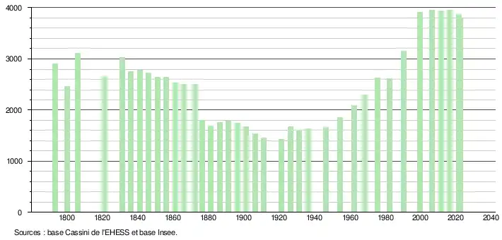 - ↑ Fiches Insee - Populations de référence de la commune pour les années 2006, 2007, 2008, 2009, 2010, 2011, 2012, 2013, 2014, 2015, 2016, 2017, 2018, 2019, 2020, 2021 et 2022.
