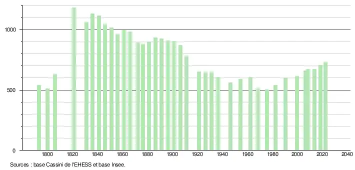 L'évolution du nombre d'habitants est connue à travers les recensements de la population effectués dans la commune depuis 1793. Pour les communes de moins de 10 000 habitants, une enquête de recensement portant sur toute la population est réalisée tous les cinq ans, les populations de référence des années intermédiaires étant quant à elles estimées par interpolation ou extrapolation[46]. Pour la commune, le premier recensement exhaustif entrant dans le cadre du nouveau dispositif a été réalisé en 2008[47].