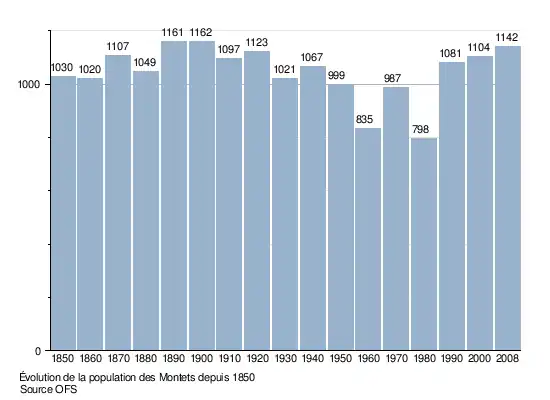 Selon l'Office fédéral de la statistique, Les Montets possèdent 1 614 habitants en 2023[1]. Leur densité de population atteint 157 hab./km2.