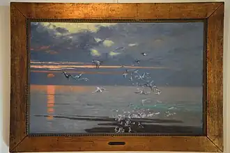 Le tableau est une marine avec au premier plan un groupe de mouettes sur un banc de sable ou en vol[2],[3].
