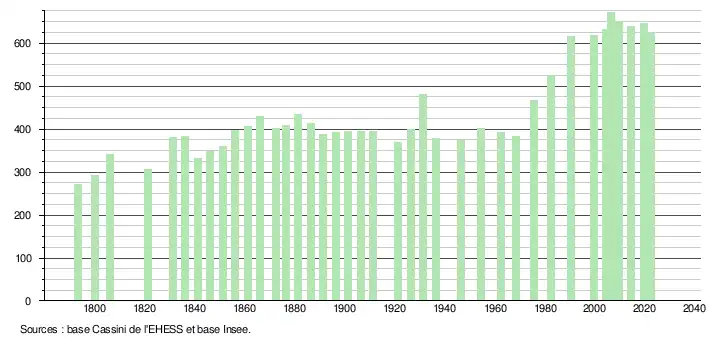 L'évolution du nombre d'habitants est connue à travers les recensements de la population effectués dans la commune depuis 1793. Pour les communes de moins de 10 000 habitants, une enquête de recensement portant sur toute la population est réalisée tous les cinq ans, les populations de référence des années intermédiaires étant quant à elles estimées par interpolation ou extrapolation[17]. Pour la commune, le premier recensement exhaustif entrant dans le cadre du nouveau dispositif a été réalisé en 2004[18].