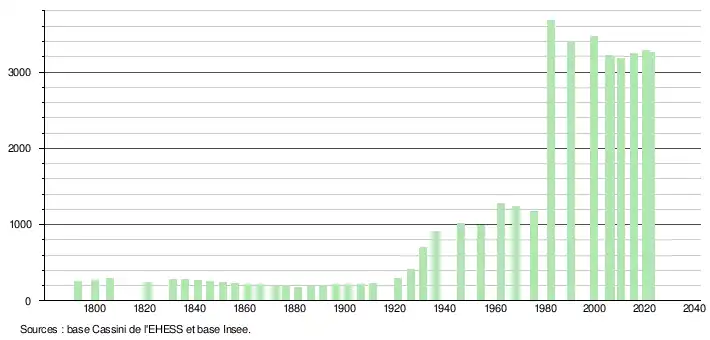 L'évolution du nombre d'habitants est connue à travers les recensements de la population effectués dans la commune depuis 1793. Pour les communes de moins de 10 000 habitants, une enquête de recensement portant sur toute la population est réalisée tous les cinq ans, les populations de référence des années intermédiaires étant quant à elles estimées par interpolation ou extrapolation[22]. Pour la commune, le premier recensement exhaustif entrant dans le cadre du nouveau dispositif a été réalisé en 2005[23].