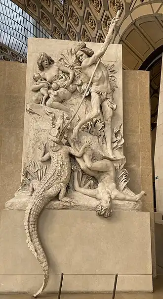Dans une scène devant évoquer les races d'Afrique, l'œuvre représente un homme plantant une sagaie dans la bouche d'un alligator prêt à dévorer une jeune femme et ses deux nourrissons et possiblement une autre femme évanouie.