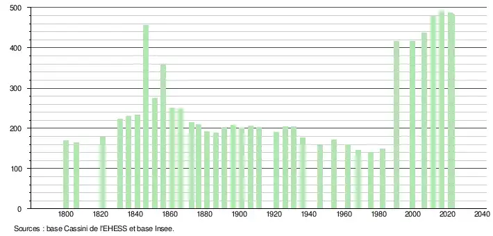 L'évolution du nombre d'habitants est connue à travers les recensements de la population effectués dans la commune depuis 1800. Pour les communes de moins de 10 000 habitants, une enquête de recensement portant sur toute la population est réalisée tous les cinq ans, les populations de référence des années intermédiaires étant quant à elles estimées par interpolation ou extrapolation[23]. Pour la commune, le premier recensement exhaustif entrant dans le cadre du nouveau dispositif a été réalisé en 2006[24].