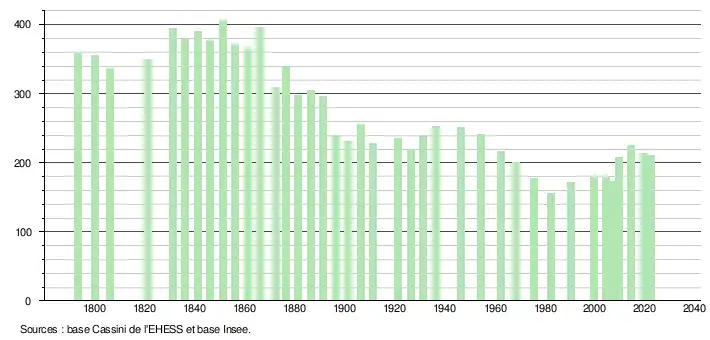 L'évolution du nombre d'habitants est connue à travers les recensements de la population effectués dans la commune depuis 1793. Pour les communes de moins de 10 000 habitants, une enquête de recensement portant sur toute la population est réalisée tous les cinq ans, les populations de référence des années intermédiaires étant quant à elles estimées par interpolation ou extrapolation[16]. Pour la commune, le premier recensement exhaustif entrant dans le cadre du nouveau dispositif a été réalisé en 2004[17].