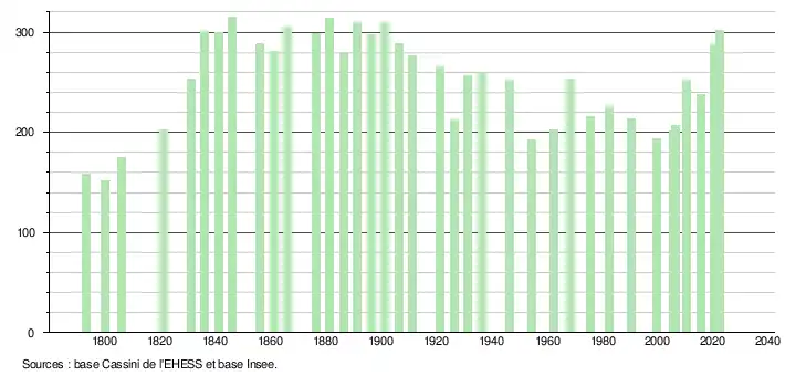 L'évolution du nombre d'habitants est connue à travers les recensements de la population effectués dans la commune depuis 1793. Pour les communes de moins de 10 000 habitants, une enquête de recensement portant sur toute la population est réalisée tous les cinq ans, les populations de référence des années intermédiaires étant quant à elles estimées par interpolation ou extrapolation[27]. Pour la commune, le premier recensement exhaustif entrant dans le cadre du nouveau dispositif a été réalisé en 2005[28].