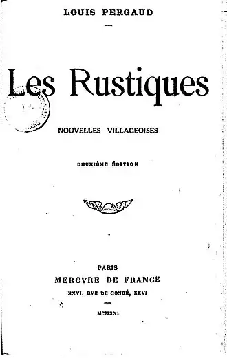 - Louis Pergaud (préf. Lucien Descaves), Les Rustiques : nouvelles villageoises, Paris, Mercure de France, , 244 p. (lire en ligne)Texte intégral de Les Rustiques sur Wikisource.