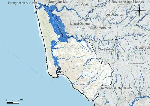 Elle est bordée au nord par l'Auzance, fleuve côtier qui se jette dans l'océan Atlantique au havre de la Gachère, ainsi que, à l'est, par un affluent, la Vertonne. Ces deux cours d'eau alimentent les marais d'Olonne.