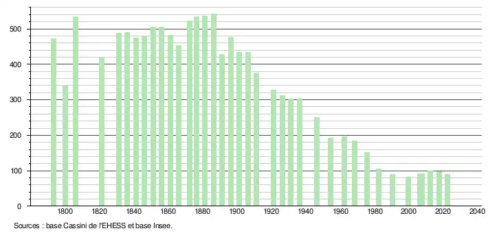 L'évolution du nombre d'habitants est connue à travers les recensements de la population effectués dans la commune depuis 1793. Pour les communes de moins de 10 000 habitants, une enquête de recensement portant sur toute la population est réalisée tous les cinq ans, les populations de référence des années intermédiaires étant quant à elles estimées par interpolation ou extrapolation[37]. Pour la commune, le premier recensement exhaustif entrant dans le cadre du nouveau dispositif a été réalisé en 2007[38].