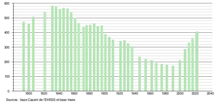 L'évolution du nombre d'habitants est connue à travers les recensements de la population effectués dans la commune depuis 1793. Pour les communes de moins de 10 000 habitants, une enquête de recensement portant sur toute la population est réalisée tous les cinq ans, les populations de référence des années intermédiaires étant quant à elles estimées par interpolation ou extrapolation[14]. Pour la commune, le premier recensement exhaustif entrant dans le cadre du nouveau dispositif a été réalisé en 2006[15].