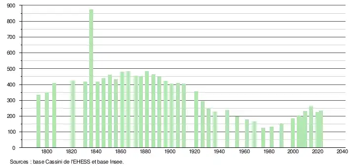 - ↑ Fiches Insee - Populations de référence de la commune pour les années 2006, 2007, 2008, 2009, 2010, 2011, 2012, 2013, 2014, 2015, 2016, 2017, 2018, 2019, 2020, 2021 et 2022.