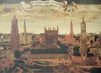 Au sommet, dans le ciel, une banderole porte l'inscription latine septem admirationes civitatis brugensis (« Les Sept Merveilles de la cité de Bruges »)[1]. Ce titre et ce thème font écho à la célèbre série des Sept Merveilles du monde antique, diffusée à la même époque par les gravures de Maarten van Heemskerck.