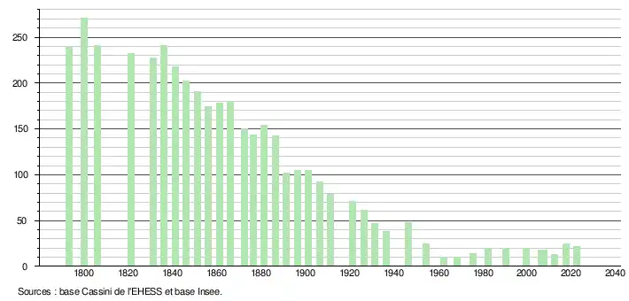 L'évolution du nombre d'habitants est connue à travers les recensements de la population effectués dans la commune depuis 1793. Pour les communes de moins de 10 000 habitants, une enquête de recensement portant sur toute la population est réalisée tous les cinq ans, les populations de référence des années intermédiaires étant quant à elles estimées par interpolation ou extrapolation[18]. Pour la commune, le premier recensement exhaustif entrant dans le cadre du nouveau dispositif a été réalisé en 2007[19].
