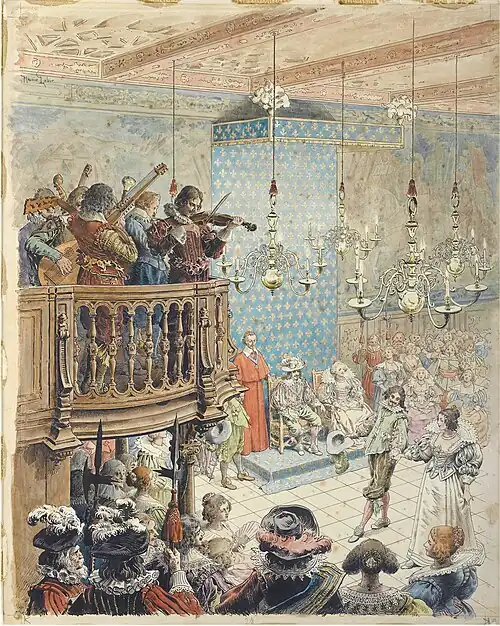 La reine Anne d'Autriche (portant ses ferrets) et le roi Louis XIII dansant le ballet de la Merlaison au Bal des Échevins.