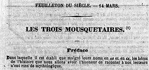 Le titre prévu à l'origine était Athos, Porthos et Aramis, mais sur une proposition de Desnoyers, chargé du feuilleton au Siècle (selon qui ce titre évoquait aux lecteurs les trois Parques), d'adopter Les Trois Mousquetaires, Dumas a accepté ce dernier titre en notant que son absurdité (puisque les héros sont au nombre de quatre) contribuerait au succès de l'œuvre[9].