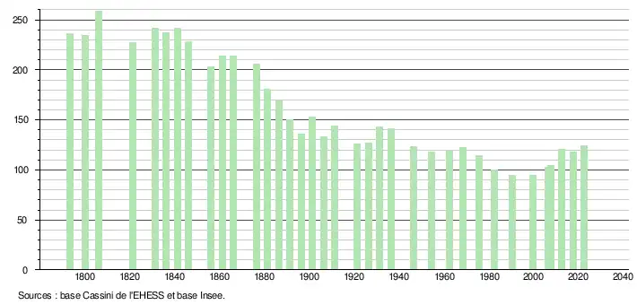 L'évolution du nombre d'habitants est connue à travers les recensements de la population effectués dans la commune depuis 1793. Pour les communes de moins de 10 000 habitants, une enquête de recensement portant sur toute la population est réalisée tous les cinq ans, les populations de référence des années intermédiaires étant quant à elles estimées par interpolation ou extrapolation[24]. Pour la commune, le premier recensement exhaustif entrant dans le cadre du nouveau dispositif a été réalisé en 2007[25].