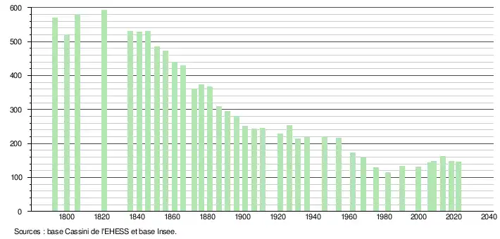 L'évolution du nombre d'habitants est connue à travers les recensements de la population effectués dans la commune depuis 1793. Pour les communes de moins de 10 000 habitants, une enquête de recensement portant sur toute la population est réalisée tous les cinq ans, les populations de référence des années intermédiaires étant quant à elles estimées par interpolation ou extrapolation[26]. Pour la commune, le premier recensement exhaustif entrant dans le cadre du nouveau dispositif a été réalisé en 2008[27].