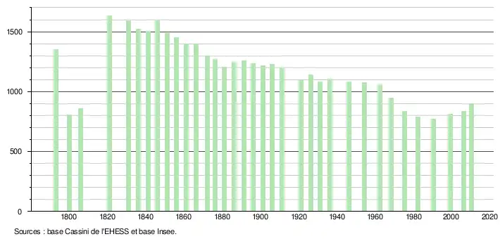 L'évolution du nombre d'habitants est connue à travers les recensements de la population effectués dans la commune depuis 1793. À partir du , les populations légales des communes sont publiées annuellement dans le cadre d'un recensement qui repose désormais sur une collecte d'information annuelle, concernant successivement tous les territoires communaux au cours d'une période de cinq ans. Pour les communes de moins de 10 000 habitants, une enquête de recensement portant sur toute la population est réalisée tous les cinq ans, les populations légales des années intermédiaires étant quant à elles estimées par interpolation ou extrapolation[9]. Pour la commune, le premier recensement exhaustif entrant dans le cadre du nouveau dispositif a été réalisé en 2005[10],[Note 1].