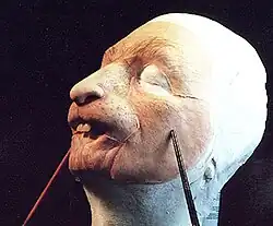 L'acteur Dominique Hulin en référence et le moulage de sa tête conçu par Jacques Gastineau pour les effets spéciaux de la scène où Godefroy décapite un soldat ennemi. | ||