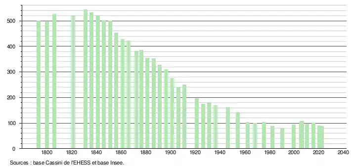L'évolution du nombre d'habitants est connue à travers les recensements de la population effectués dans la commune depuis 1793. Pour les communes de moins de 10 000 habitants, une enquête de recensement portant sur toute la population est réalisée tous les cinq ans, les populations de référence des années intermédiaires étant quant à elles estimées par interpolation ou extrapolation[15]. Pour la commune, le premier recensement exhaustif entrant dans le cadre du nouveau dispositif a été réalisé en 2005[16].