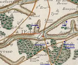 La carte de Cassini ci-contre montre qu'au milieu du XVIIIè siècle, l'Échelle est une paroisse. Le village est situé sur le cours de la Rigole du Noirieux et un moulin à eau, symbolisé par une roue dentée, fonctionne en aval.