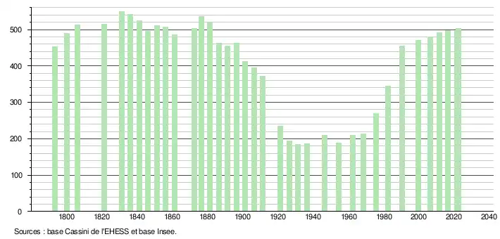 L'évolution du nombre d'habitants est connue à travers les recensements de la population effectués dans la commune depuis 1793. Pour les communes de moins de 10 000 habitants, une enquête de recensement portant sur toute la population est réalisée tous les cinq ans, les populations de référence des années intermédiaires étant quant à elles estimées par interpolation ou extrapolation[21]. Pour la commune, le premier recensement exhaustif entrant dans le cadre du nouveau dispositif a été réalisé en 2006[22].